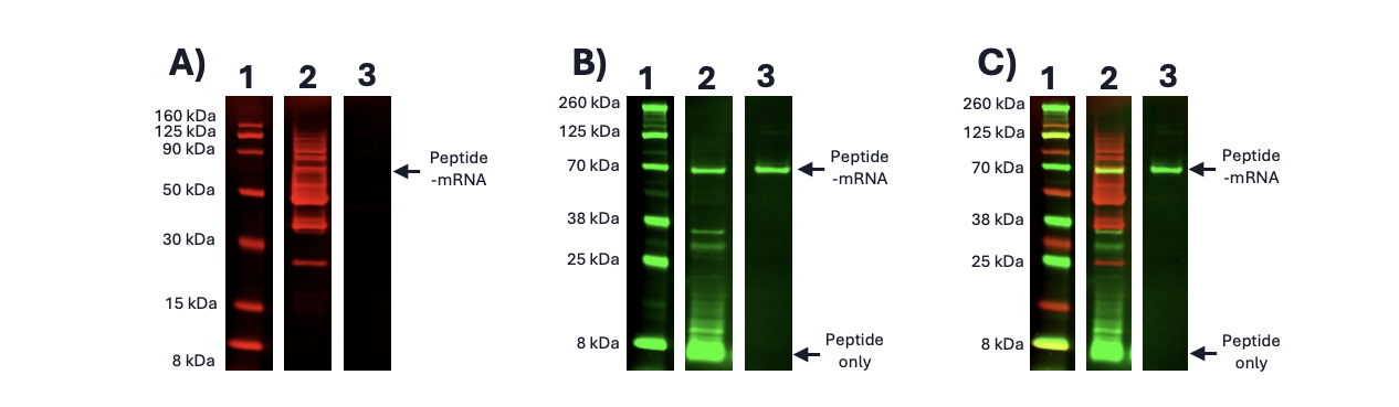 An HA epitope tag ultimately emerged as the most reliable and sensitive solution (Figure 1B). With the right placement, HA-tagged peptide–mRNA fusions produced a clear, specific band at the expected molecular weight, both in crude translation mixtures and after purification. This gave us a fast, intuitive way to answer basic but essential questions: did translation work, did fusion occur, and did purification improve signal quality?