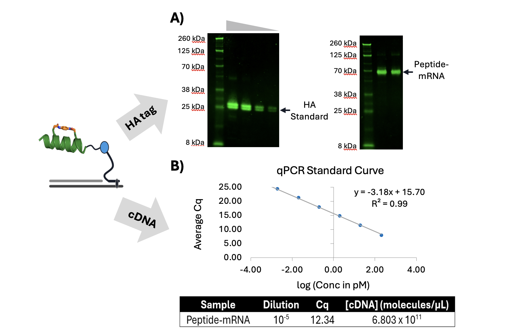 Our first instinct was to lean on techniques we were already familiar with. Immunoblotting and quantitative PCR (qPCR) are workhorses in molecular biology, and there is prior literature showing that both can be applied to mRNA display systems. Several groups have validated peptide–mRNA fusions using epitope tags such as FLAG3,6 and T75, while others have used qPCR to quantify fusion recovery or enrichment across selection rounds.4,7 That literature suggested a non-radioactive path was viable, but translating those demonstrations into a routine workflow still required innovation and iteration.